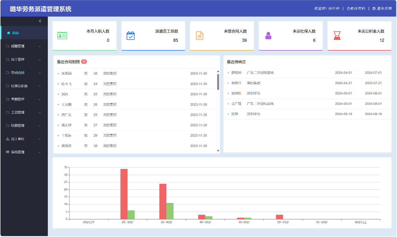 璐华劳务派遣管理软件集成了众多人力资源服务公司的管理思想,主要功能包含:劳务派遣人员管理、劳动合同管理、社保公积金管理、出勤管理、工资管理、结算管理、用工单位管理、系统管理八大模块及用工单位平台、员工自助查询平台。