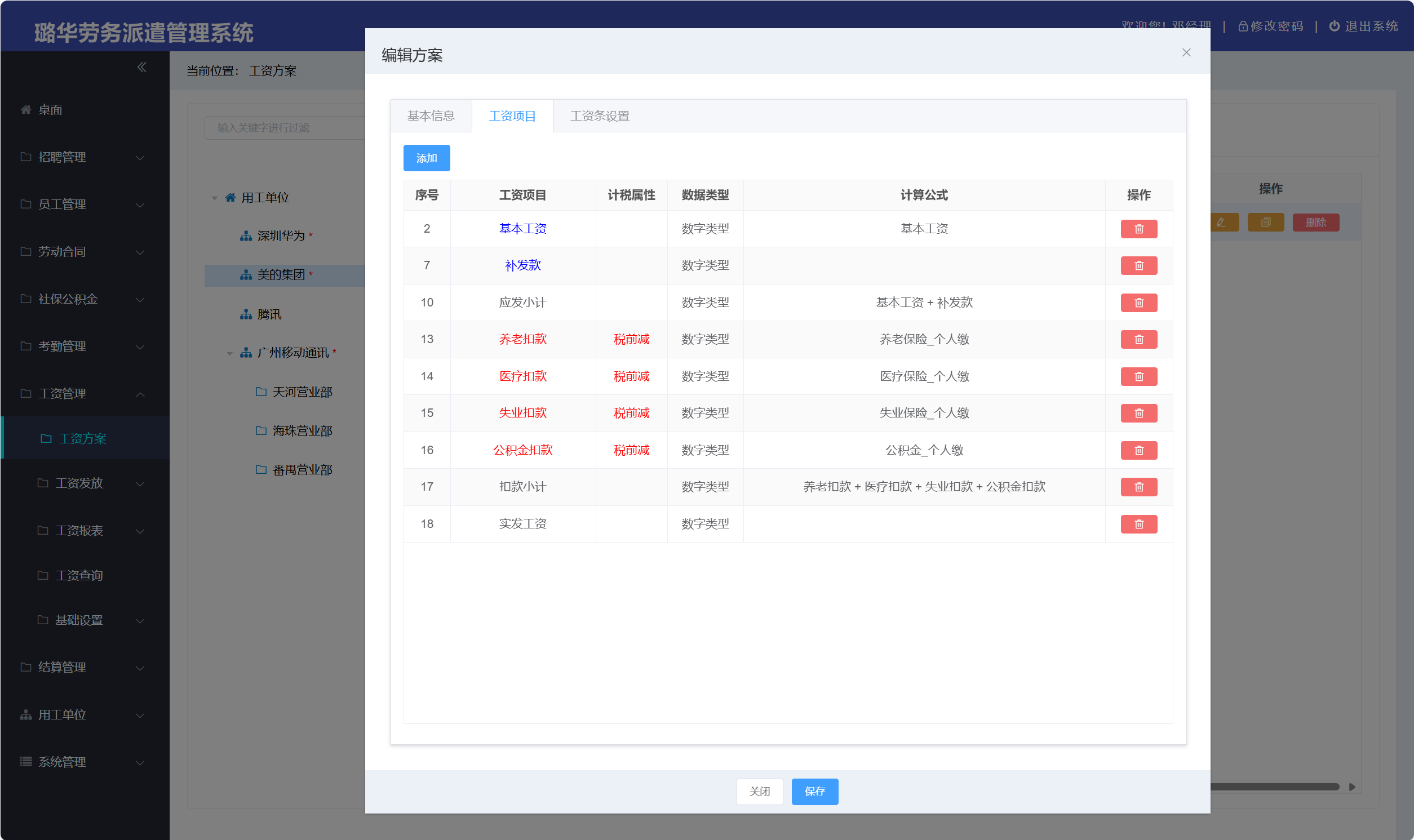 设计派遣工的工资计算方案,自定义添加应发工资项、应扣工资项,实发工资项为系统默认项。