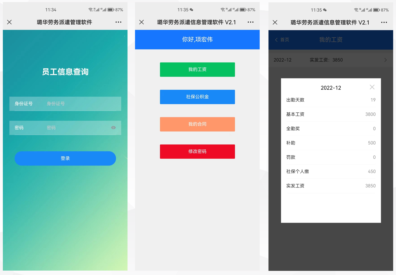 员工自助查询平台支持智能手机扫二维码登陆,派遣工可查询本人的工资信息、社保信息、劳动合同信息。